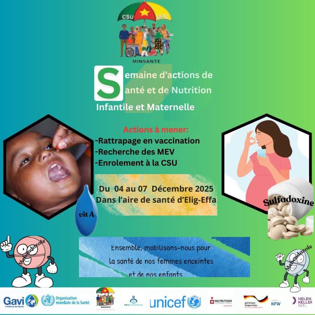 Du 4 au 7 décembre 2025, la Délégation Régionale de la Santé Publique du Centre organise la Semaine d’Actions de Santé et de Nutrition Infantile et Maternelle (SASNIM2). Au cœur de la campagne : la vitamine A et le déparasitage, deux interventions essentielles destinées à 1 079 488 enfants de 12 à 59 mois dans les 28 districts. Quatre jours pour renforcer leur immunité et prévenir les carences.